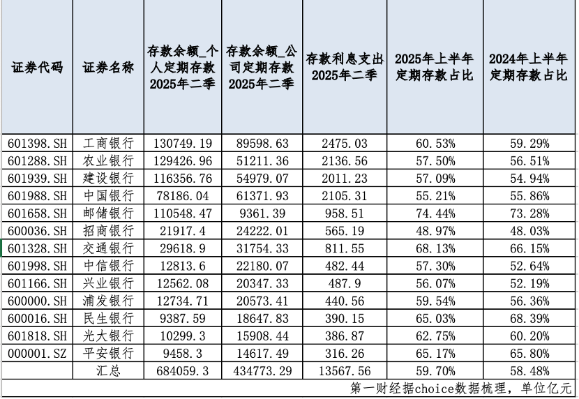 记者注意到,存款定期化趋势依然存在。按照(个人定期存款余额+公司定期存款余额)/总存款余额计算,Choice数据显示,2025年上半年上述13家银行的定期存款占比约为59.7%,较2024年上半年有所增加。其中,仅有3家银行的定期存款占比出现下降,其余10家均出现不同程度地升高。